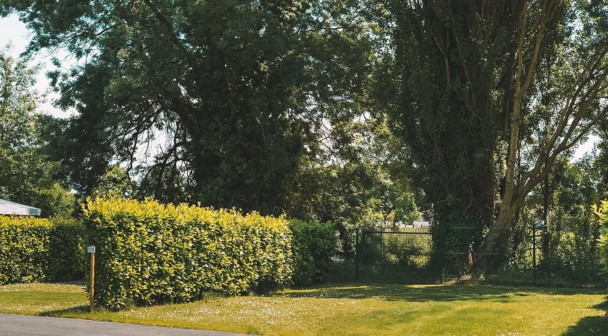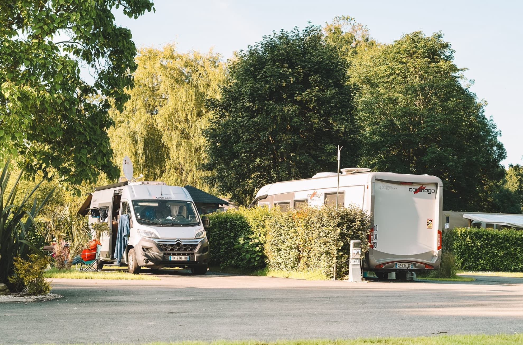 Emplacement plat et herbeux sous les platanes, peupliers et acacias, délimité par des haies pour plus d’intimité. Branchement électrique 10A inclus avec point d'eau à portée de main.