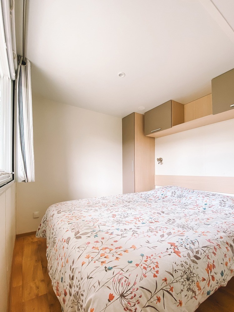 Mobil-home PMR. Le mobil-home Andaro est conçu pour les besoins spécifiques équipés et aménagés PMR, incluant une place de parking sur le côté.
