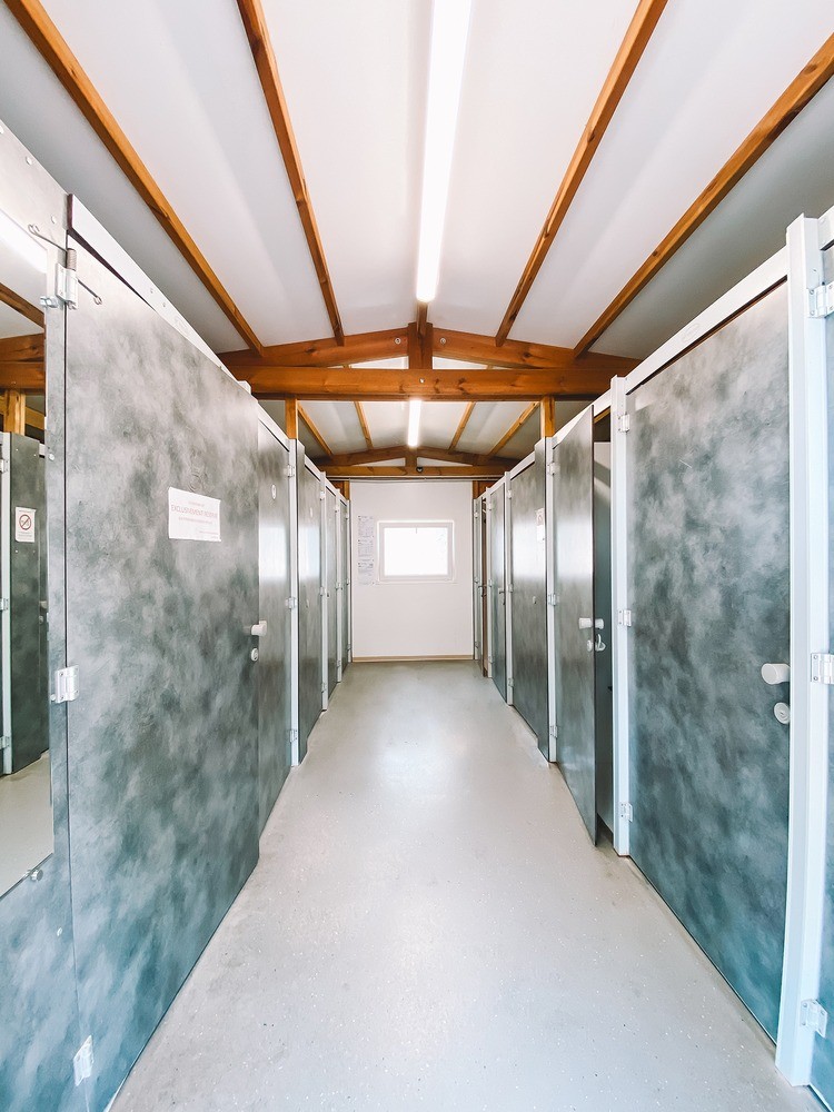 Sanitaires bien équipés. Deux blocs sanitaires avec cabines individuelles, WC, douches, espace bébé avec baignoire et table à langer ainsi que des équipements adaptés aux personnes à mobilité réduite.