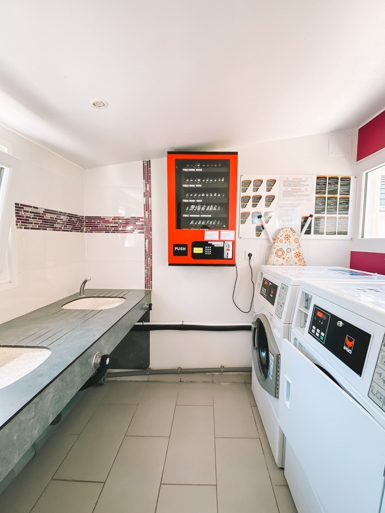 Laverie pratique. Machine à laver (distributeur de lessive payante), sèche-linge, fer et table à repasser : tout pour rentrer l’esprit léger ! (Jetons en vente à la réception.)